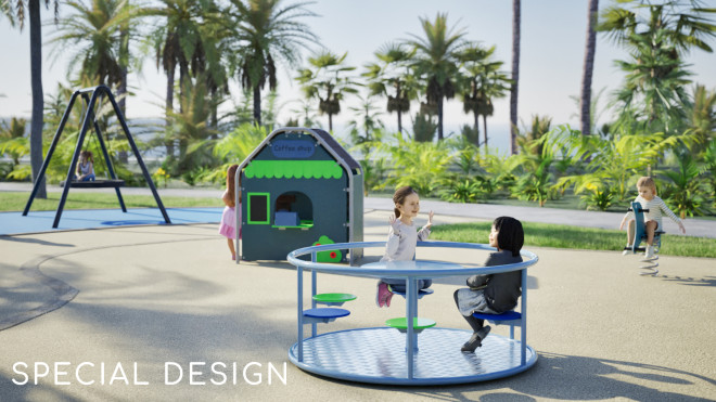 تم تصنيع Carousel باستخدام الفولاذ المطلي بالمسحوق لضمان متانة عالية ومقاومة للعوامل الجوية، مع إضافة مكونات من البولي إيثيلين عالي الكثافة (HDPE) الذي يوفر سطحًا ناعمًا ومريحًا للأطفال أثناء اللعب.